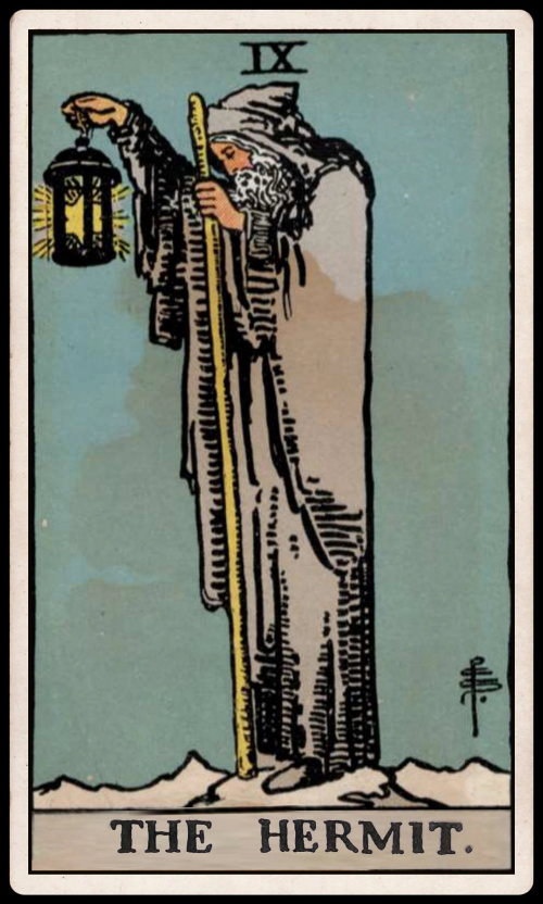 마법사(I)가 타로의 시작에서 "행동하라"고 외쳤다면, 은둔자는 그 마법사가 늙어서 된 모습이다. 세상의 모든 것을 경험하고, 모든 영광과 고통을 거친 후에, 결국 중요한 것은 내면에 있음을 깨달은 현자. 산꼭대기에 홀로 서서 등불 하나로 다음 한 걸음만 비추는 사람.