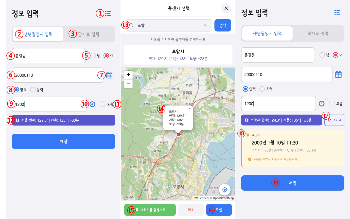 ⑰을 터치하면 초기화 가능합니다. ⑱은 출생지를 기준으로 계산한 ‘태양시’ 정보입니다.
