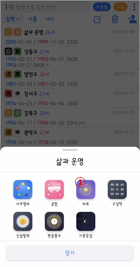 사주 정보 입력 중 다시 목록으로 돌아가려면 ①을 터치해주세요.