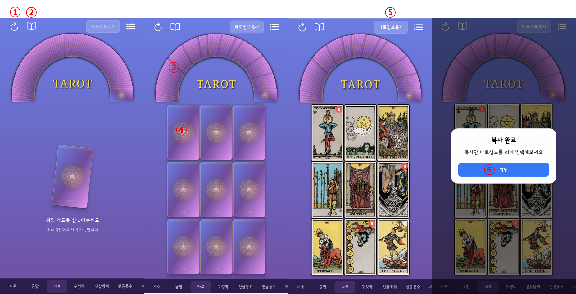 ③과 같이 타로 카드를 터치하면 아래 ④처럼 타로 카드가 선택이 됩니다.